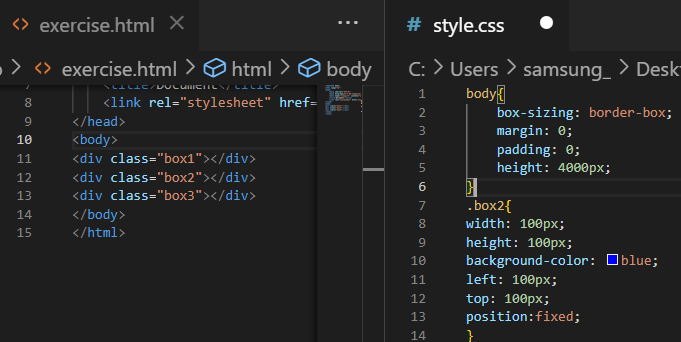 fixed -> 뷰포트 기준으로 배치합니다. 지정된 위치에 고정합니다.