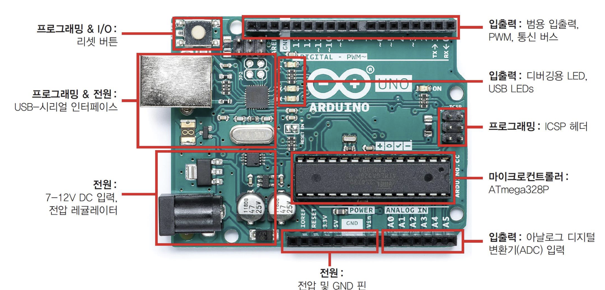 입출력 : 센서, 액추에이터 등 입출력 장치 연결 (디지털 핀과 아날로그 핀을 통해 센서, 모터, LED 등 다양한 입출력 장치를 연결하고 제어 가)